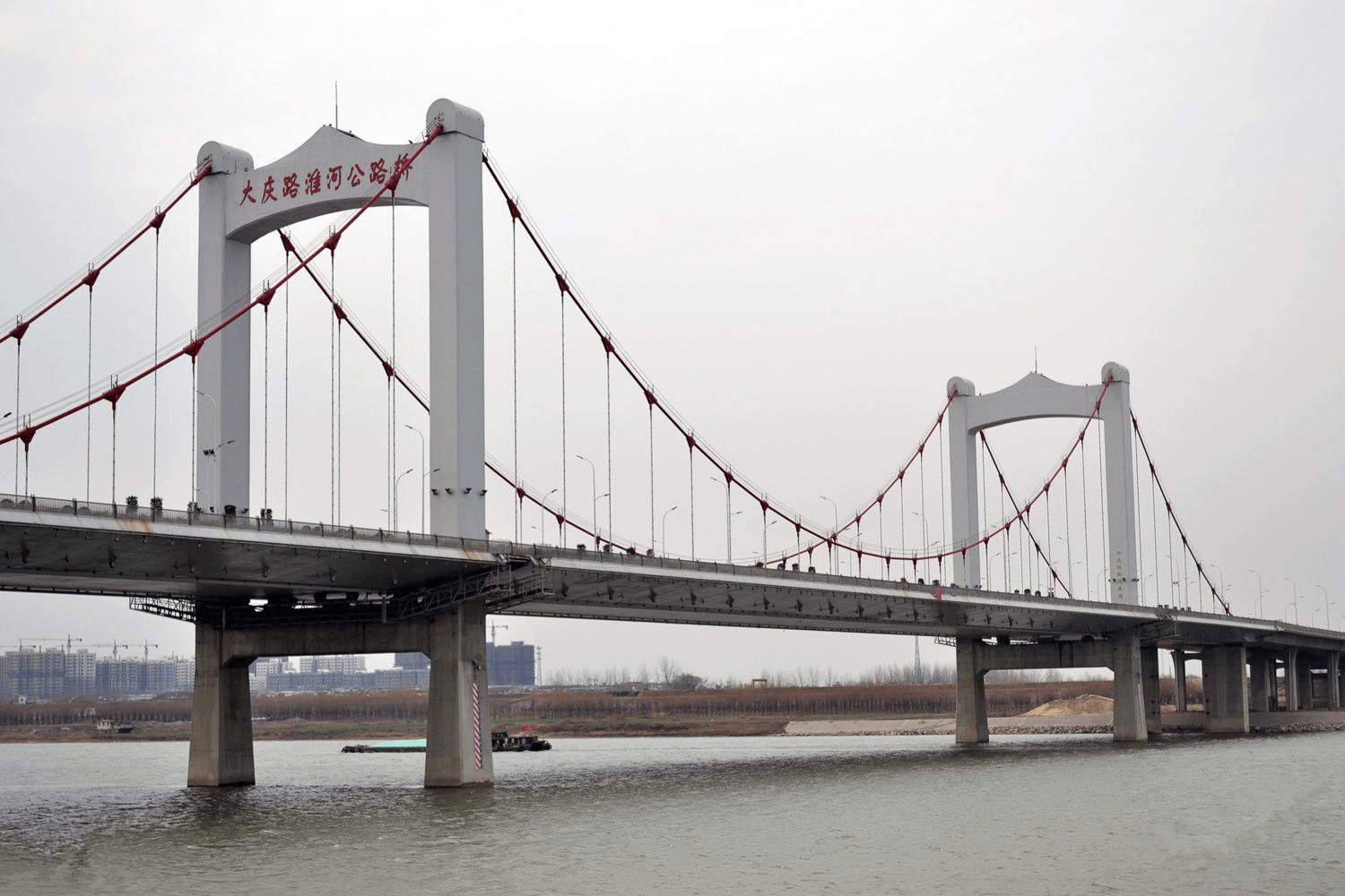 蚌埠市大慶路淮河公路橋于2009年12月開建,工期為3年,是蚌埠第三座淮河大橋,工程投資總概算達6.87億元。全線將設(shè)互通立交一處,采用雙向六車道設(shè)計,并設(shè)置非機動車道和人行道,設(shè)計速度60公里/小時。主橋采用雙塔雙索面自錨式懸鎖結(jié)構(gòu),路橋全長2.38公里,其中主橋長1778米,兩端接線602米,南岸設(shè)有四層八向互通立交,是淮河上第一座自錨式懸鎖橋。